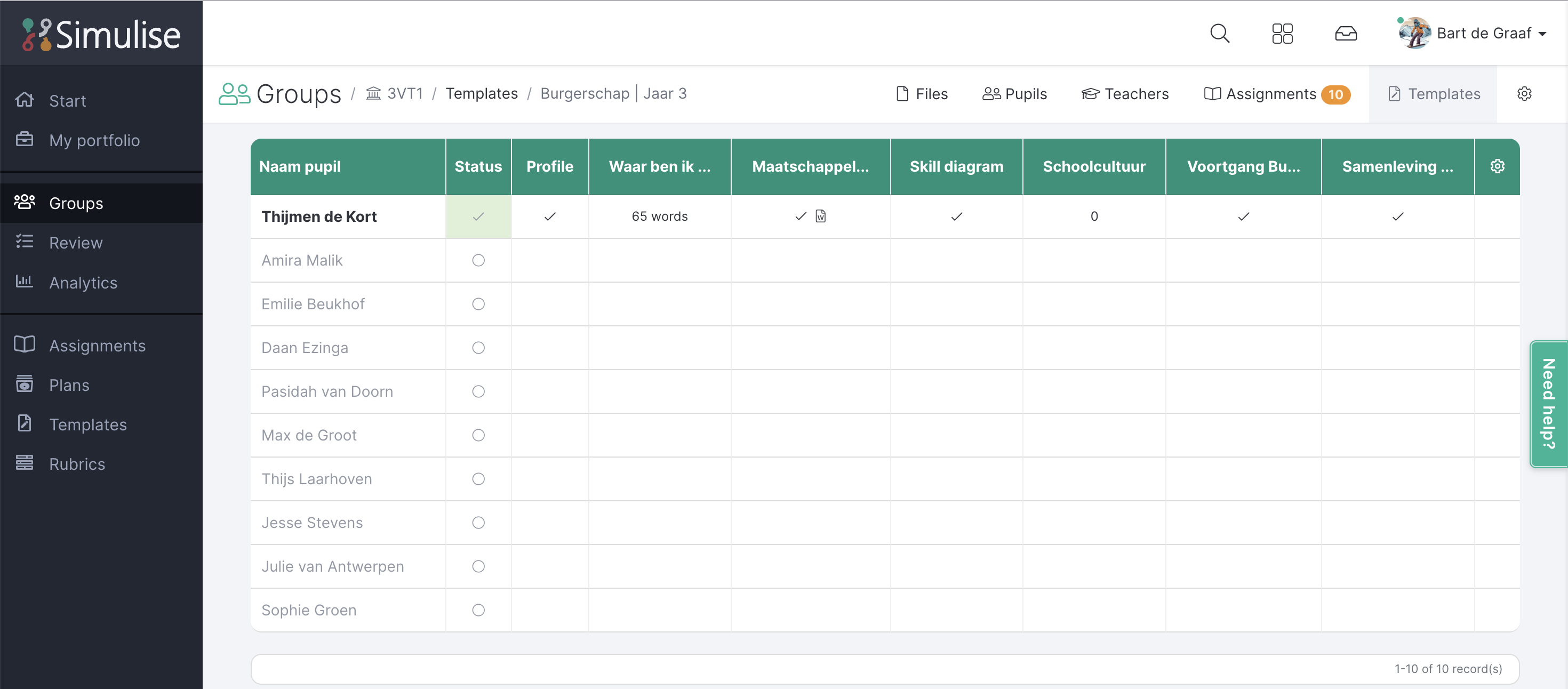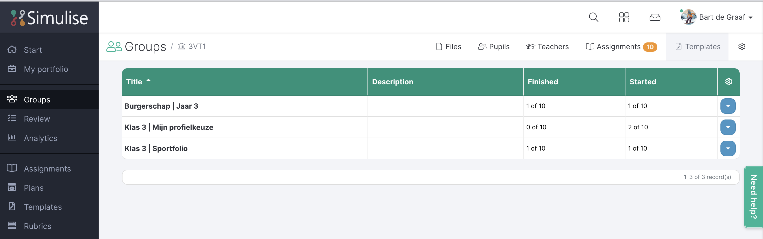 Page templates can be created and distributed to students. If the student fills out the template, it will appear in the student's portfolio. If the template has been distributed to a group, you can quickly see which students have filled out the template and to what extent. To view this, navigate to the group overview and select the Templates tab.